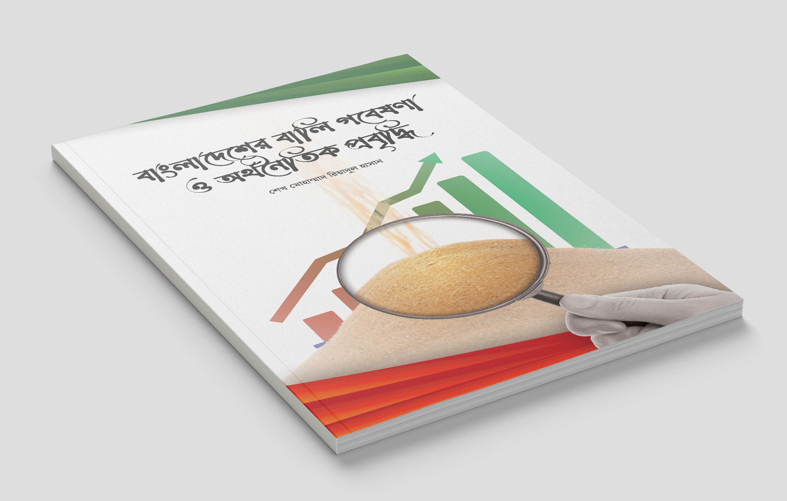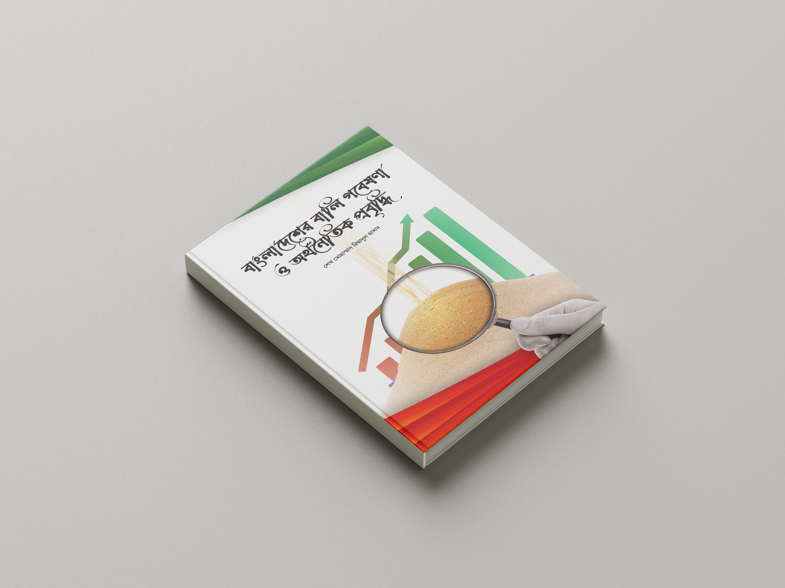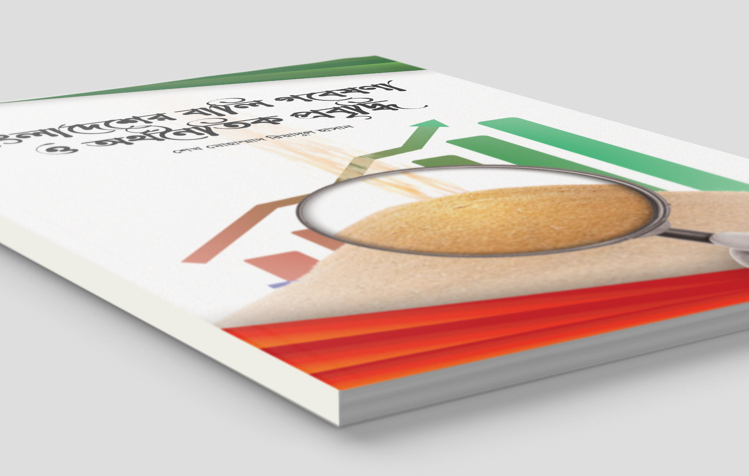 This editorial project showcases the cover design of a research-based publication focusing on Bangladesh’s Sand economy and its economic impact, written in Bangla. The visual concept integrates data representation (graph bars) with agricultural symbolism (magnified rice grains), signifying the bridge between rural reality and policy analysis.