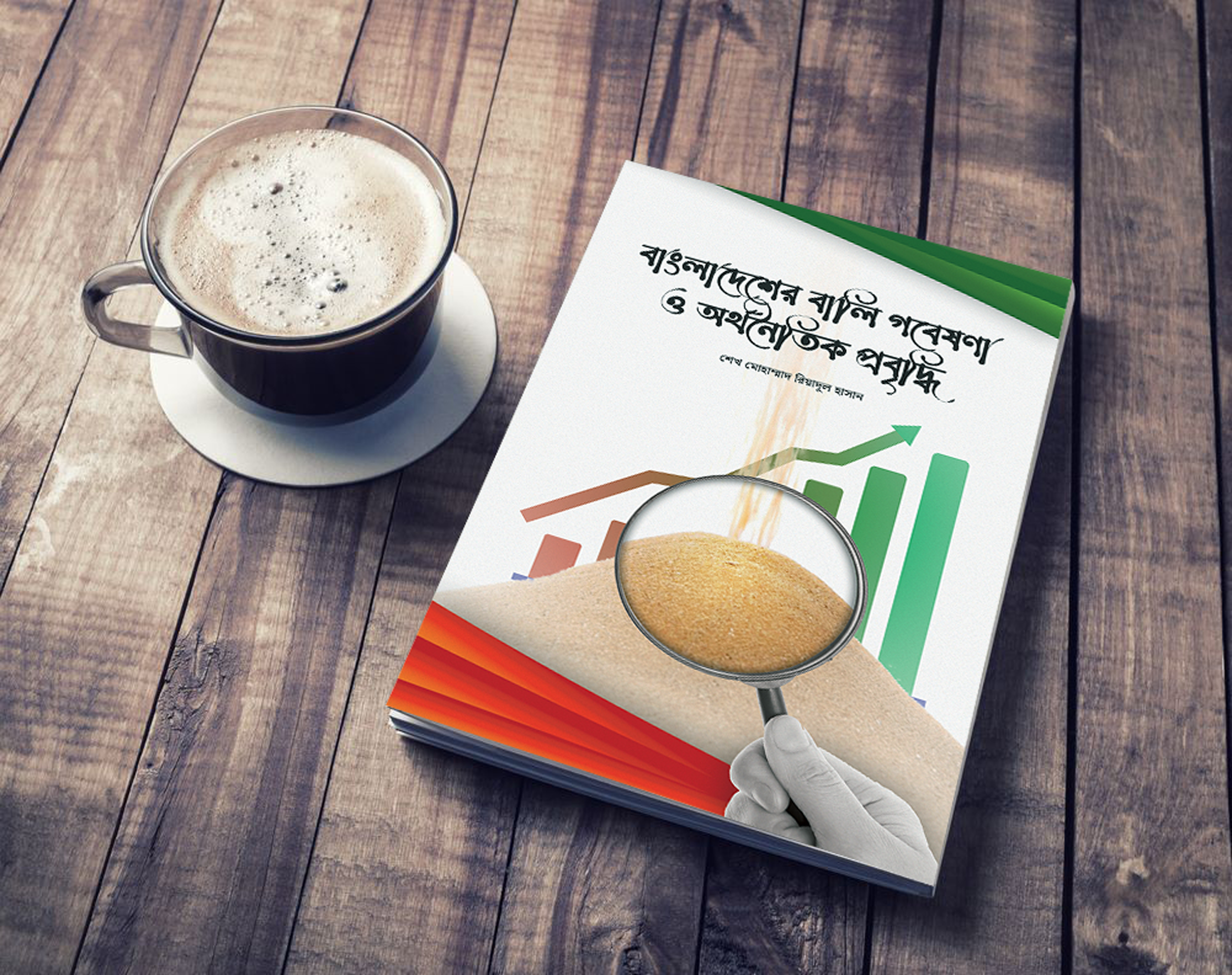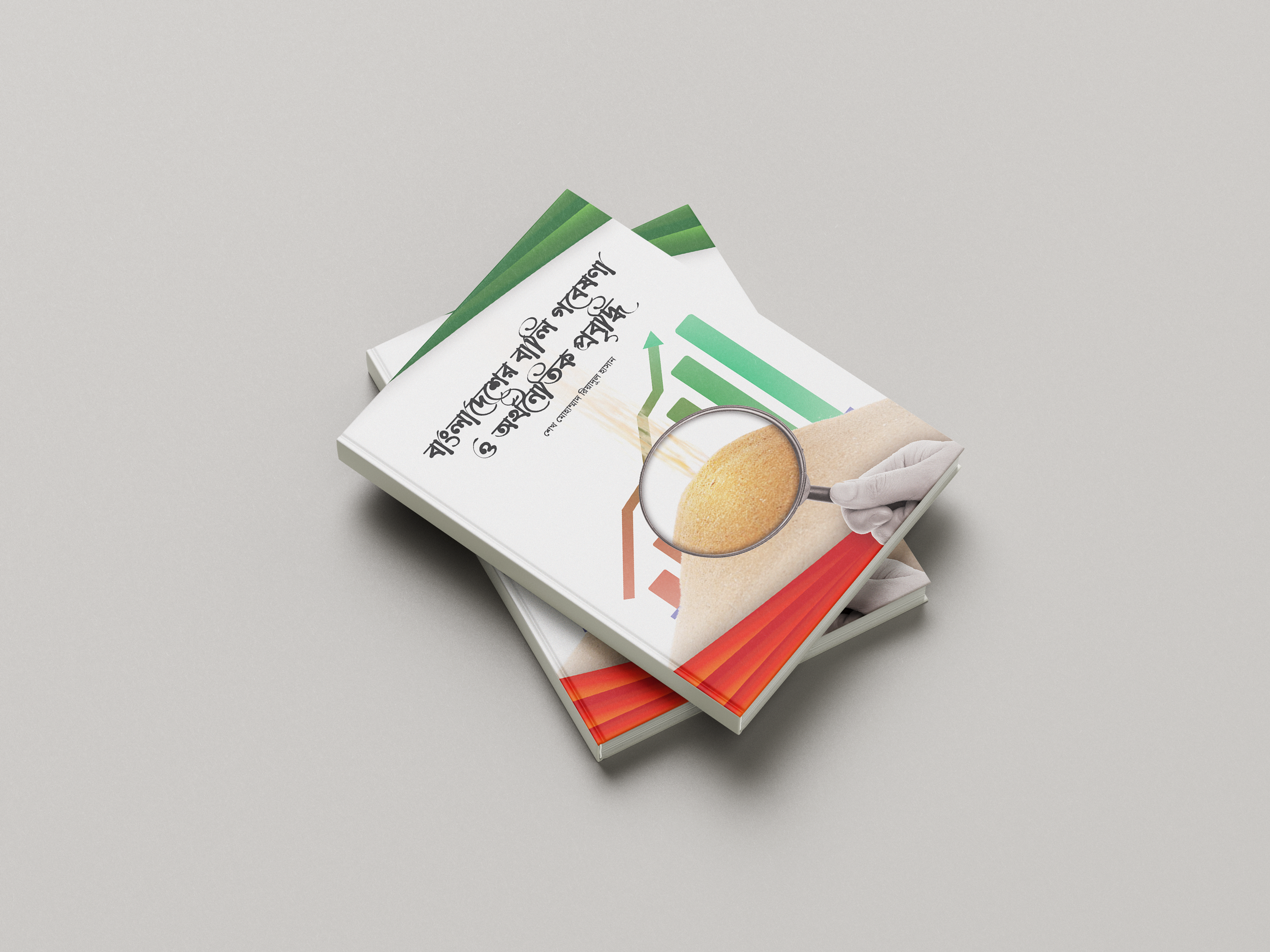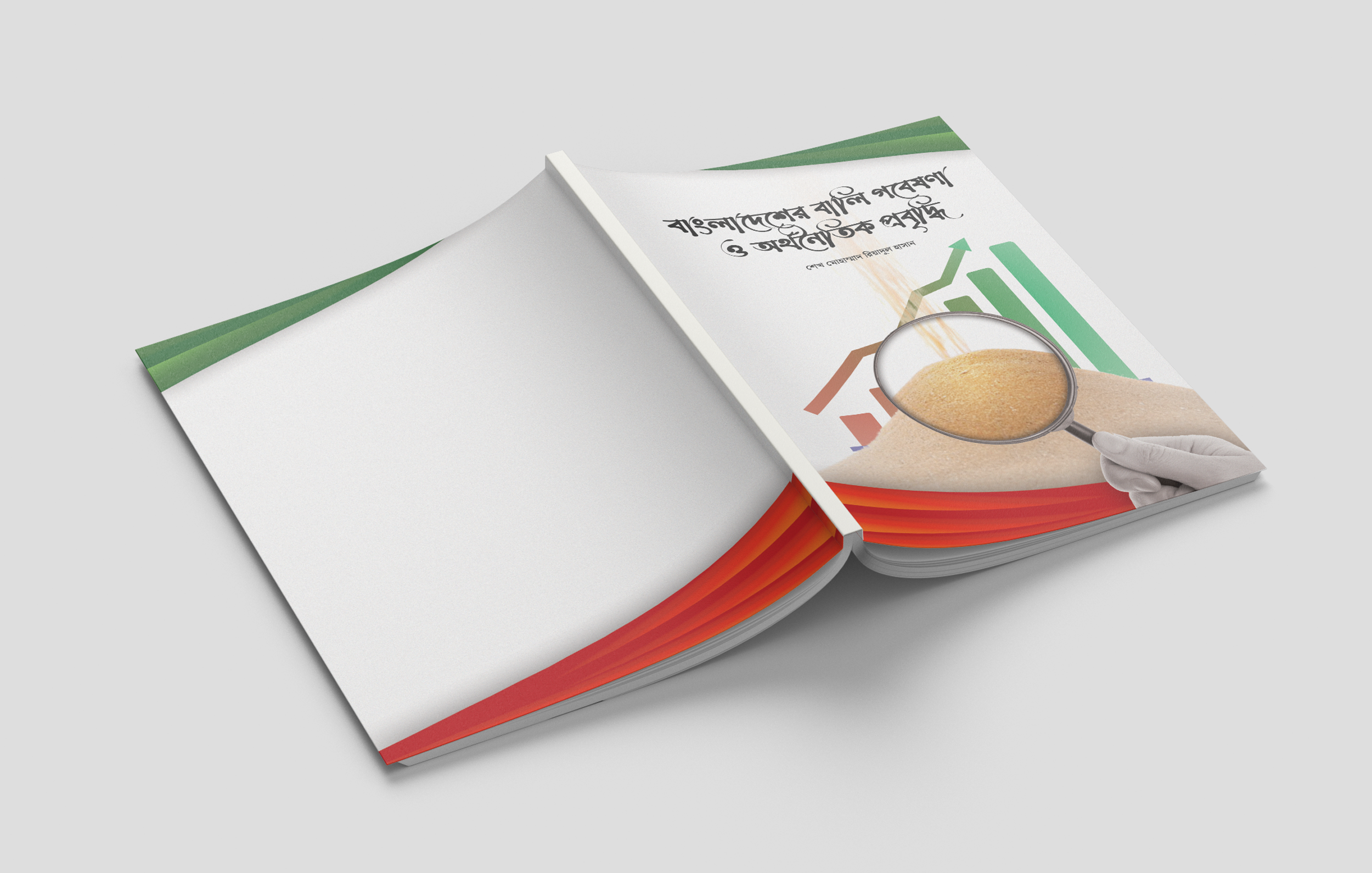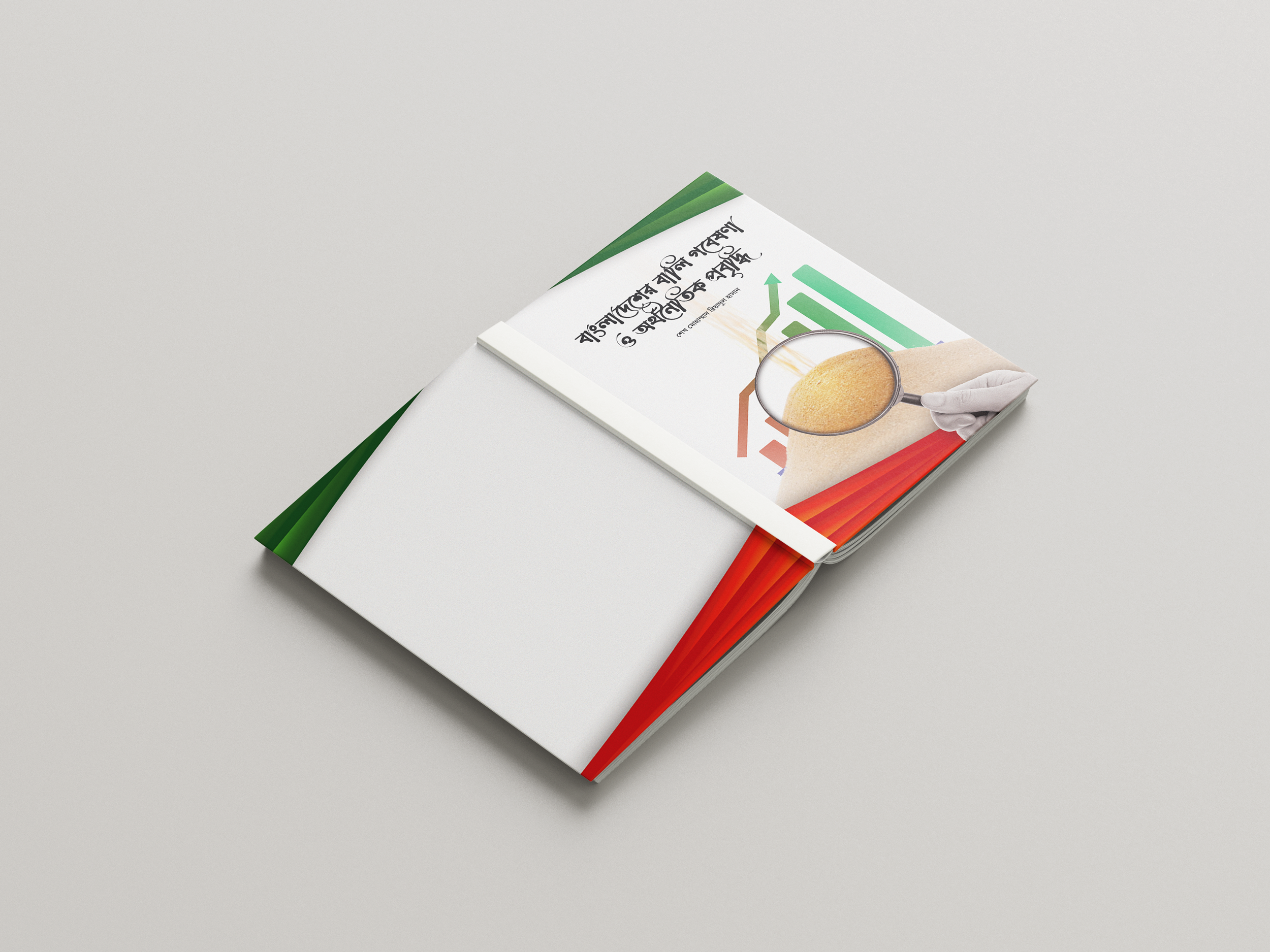 This editorial project showcases the cover design of a research-based publication focusing on Bangladesh’s Sand economy and its economic impact, written in Bangla. The visual concept integrates data representation (graph bars) with agricultural symbolism (magnified rice grains), signifying the bridge between rural reality and policy analysis.