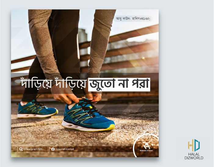 ১২। "দাঁড়িয়ে দাঁড়িয়ে জুতো না পরা। বিশেষ করে শো জুতা।" - আবু দাউদ- ৪১৩৫